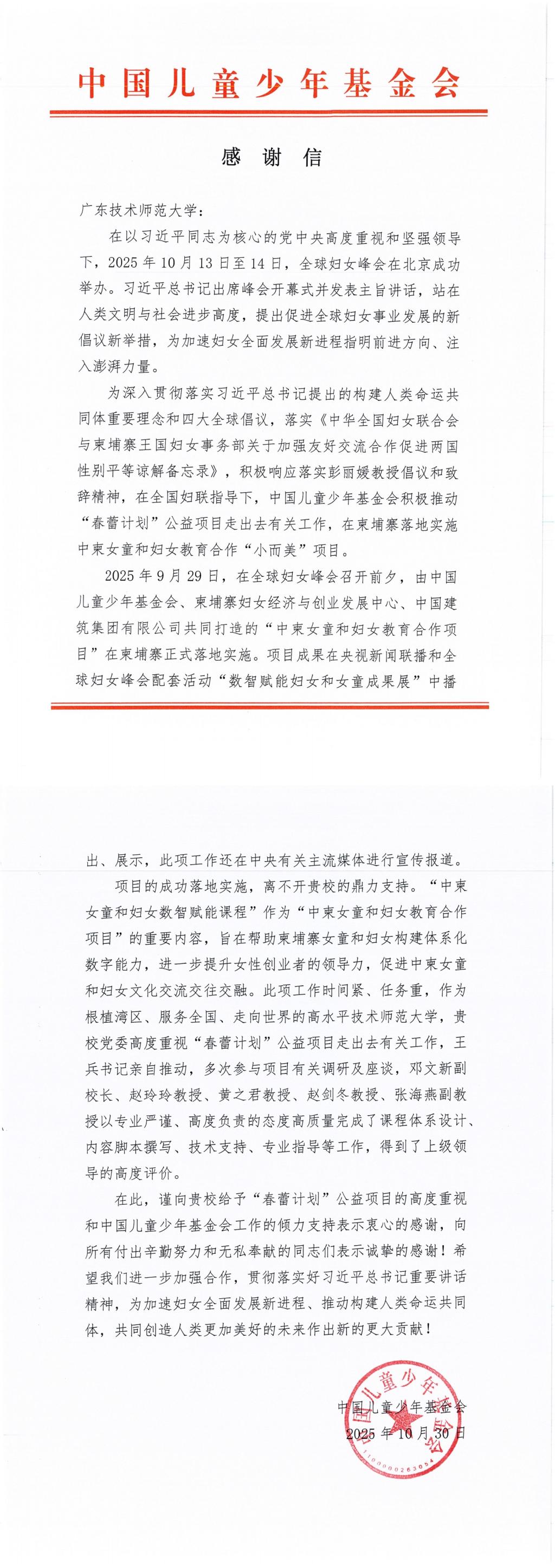 • 中國(guó)兒童少年基金會(huì)向我校發(fā)來(lái)感謝信 贊譽(yù)我校在中柬女童和婦女教育合作項(xiàng)目中貢獻(xiàn)突出